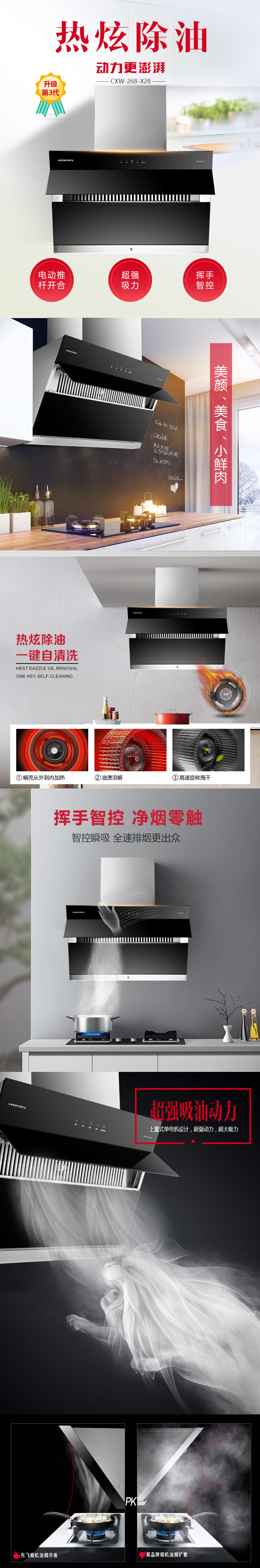 熱炫除油 一鍵自清洗 超強吸油動力 揮手智控 凈煙零觸 電動推桿開合 反轉(zhuǎn)深吸進風(fēng)網(wǎng)設(shè)計 黑晶玻璃 輕輕一抹 煥然一新 大油杯貼墻設(shè)計 閃電般速吸油煙 21m3/min