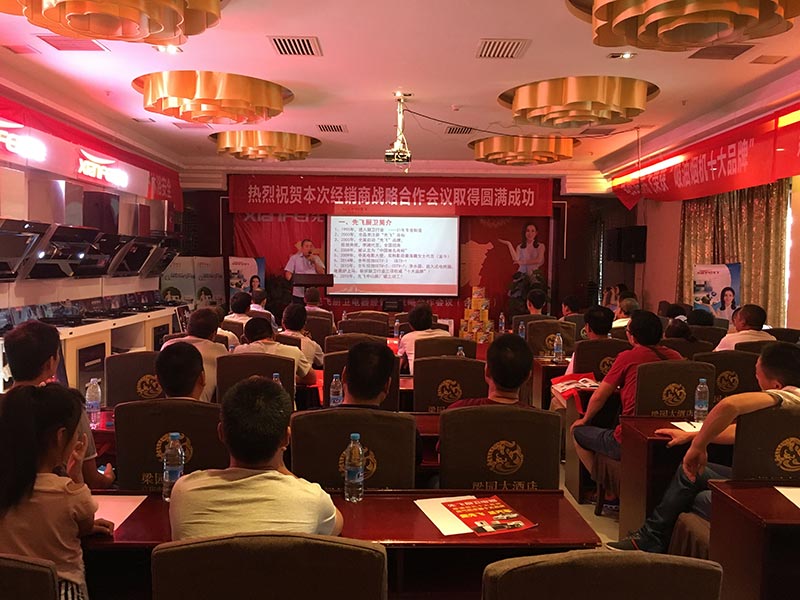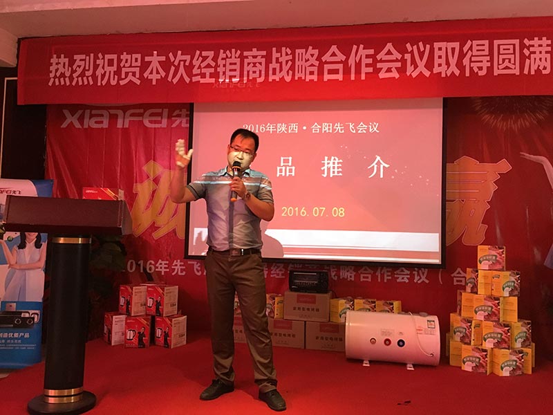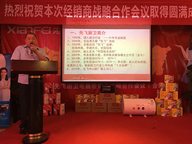 會議現(xiàn)場,首先先飛西北區(qū)域總監(jiān)孟總對參會客戶表示由衷的歡迎!其次,先飛電器全國營銷總監(jiān)聶總,對于廚衛(wèi)行業(yè)、先飛品牌、未來先飛做了深入淺出的講解,不間斷的掌聲也足以證明客戶的共鳴與認(rèn)同!先飛華北區(qū)域總監(jiān)趙總,通過對產(chǎn)品全面細(xì)致的講解,使參會客戶更加堅(jiān)定與先飛合作的信心!