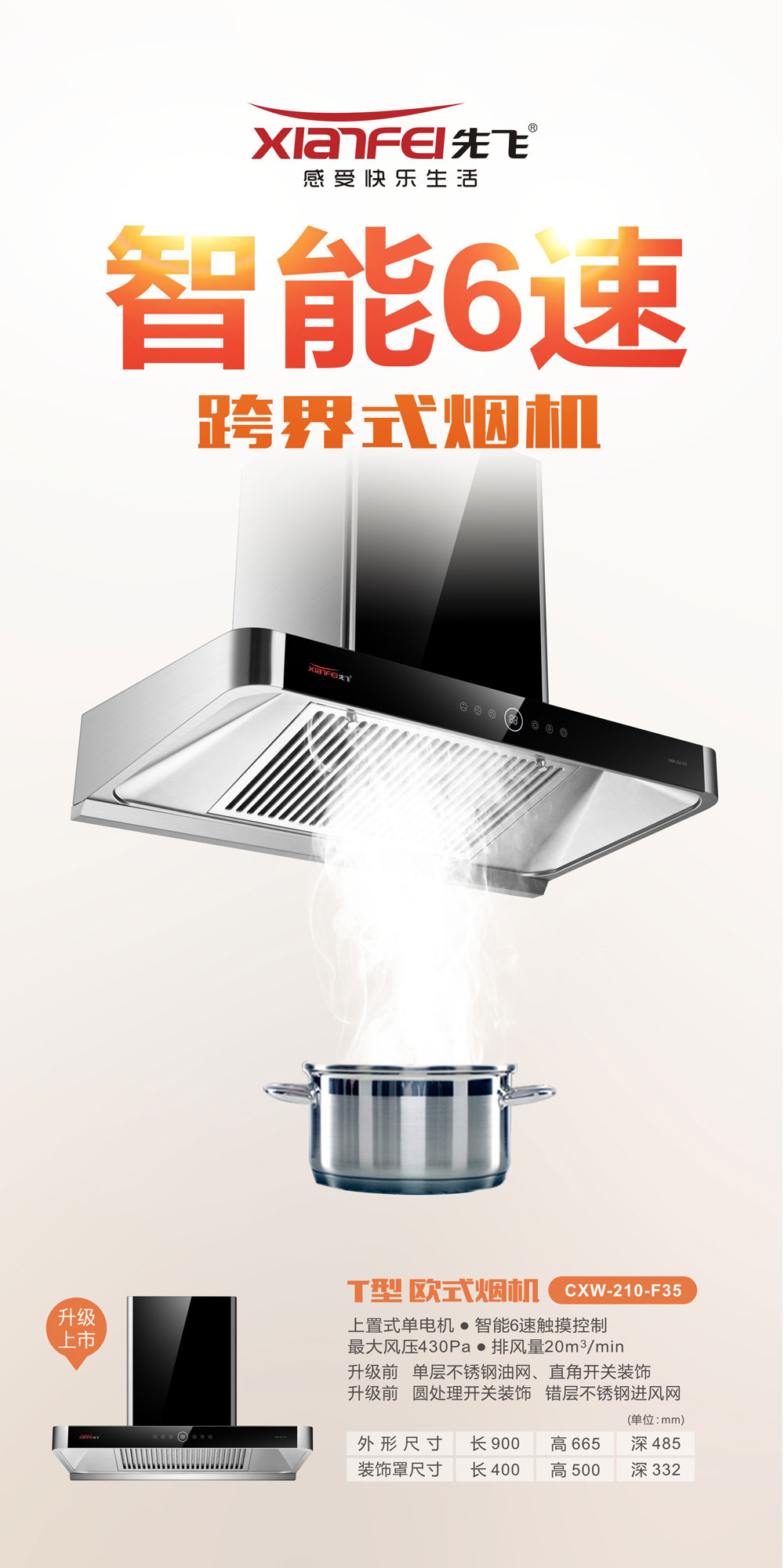 上置式單電機,智能6速觸摸開關(guān),最大風(fēng)壓可達430Pa,排風(fēng)量20m3/min,900長,配置升級如下: