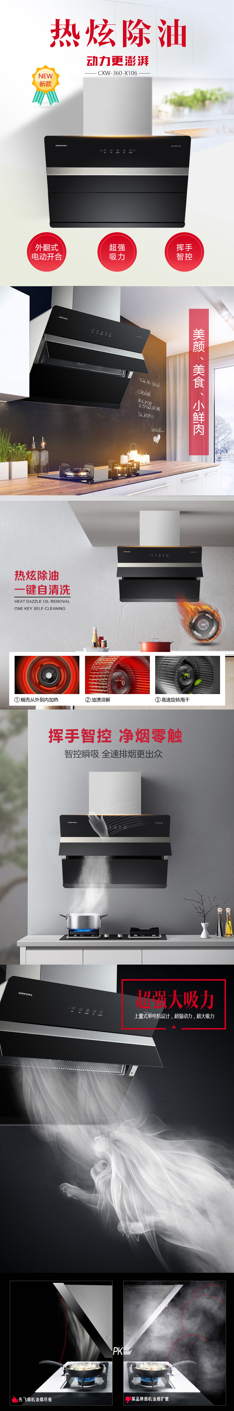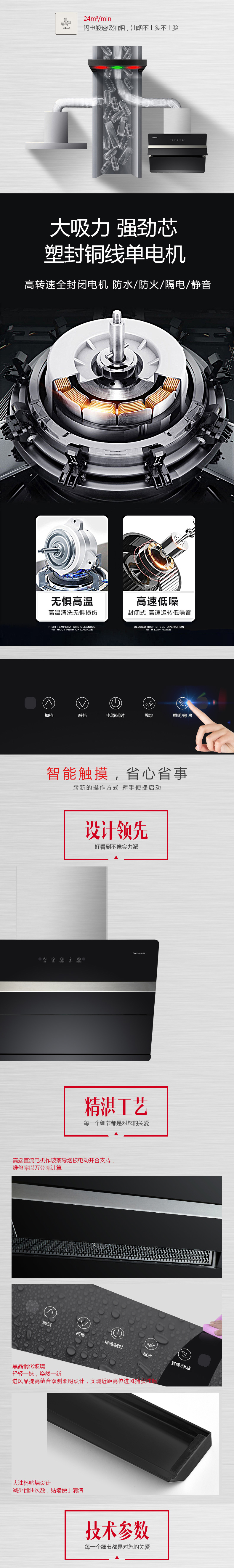 熱炫除油 一鍵自清洗 外翻式電動開合 超強(qiáng)吸油動力 揮手智控 凈煙零觸 黑晶玻璃 輕輕一抹 煥然一新 大油杯貼墻設(shè)計 閃電般速吸油煙 24m3/min