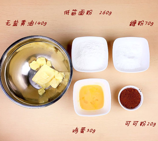 無鹽黃油 140g、糖粉 70g、雞蛋 50g、低筋面粉 260g、可可粉 20g