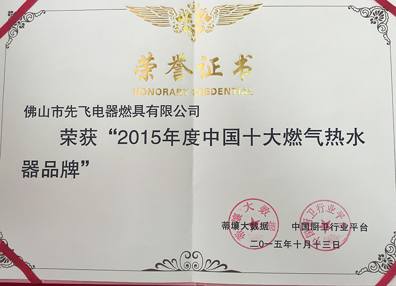 2015年10月15日,中國(guó)廚衛(wèi)行業(yè)平臺(tái)公布了“2015年度十大燃?xì)鉄崴髌放啤卑駟危蕊w公司榮獲“2015年度十大燃?xì)鉄崴髌放啤薄?