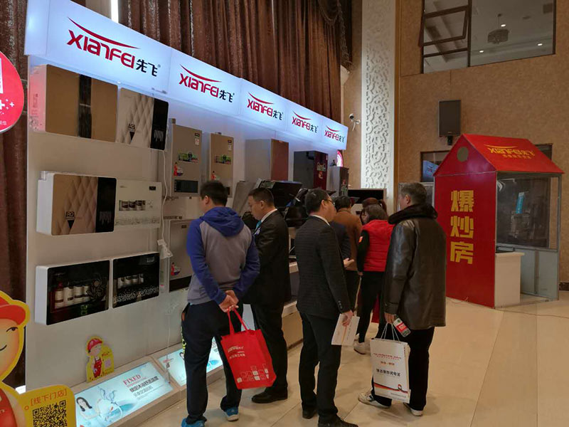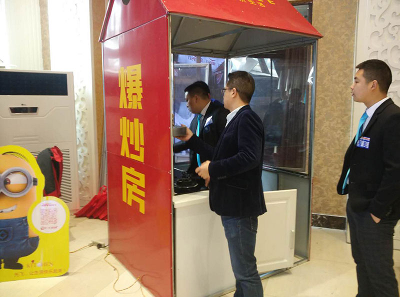 先飛時(shí)尚的產(chǎn)品掛在白色高檔烤漆背板上,高端大氣上檔次。隨處可見的二維碼,在展廳布置得錯(cuò)落有致,層次分明。經(jīng)銷商們掏出手機(jī)就能輕松了解更多產(chǎn)品,將線上線下無縫對(duì)接。蒸霧鍋和爆炒房可以讓大家更為直觀的看到產(chǎn)品的效果。