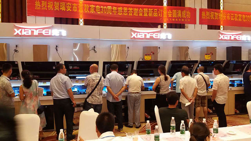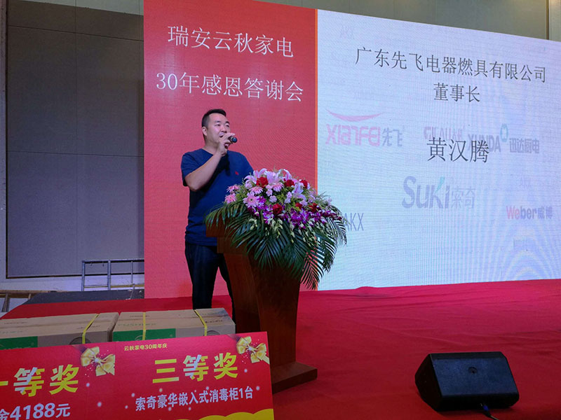 編者按:2016年8月8日下午,云秋家電30周年感恩答謝會暨2016年先飛秋季新品訂貨會在瑞安喜來君悅大酒店火爆召開!溫州地區(qū)參會經銷商朋友多達30桌,近300多人。在云秋家電30周年之際,先飛公司董事長黃漢騰先生在會上回顧往昔,展望未來,分享先飛公司近況與新品,贏得大家熱烈掌聲!會議期間收款超過300萬,標志著會議圓滿成功!