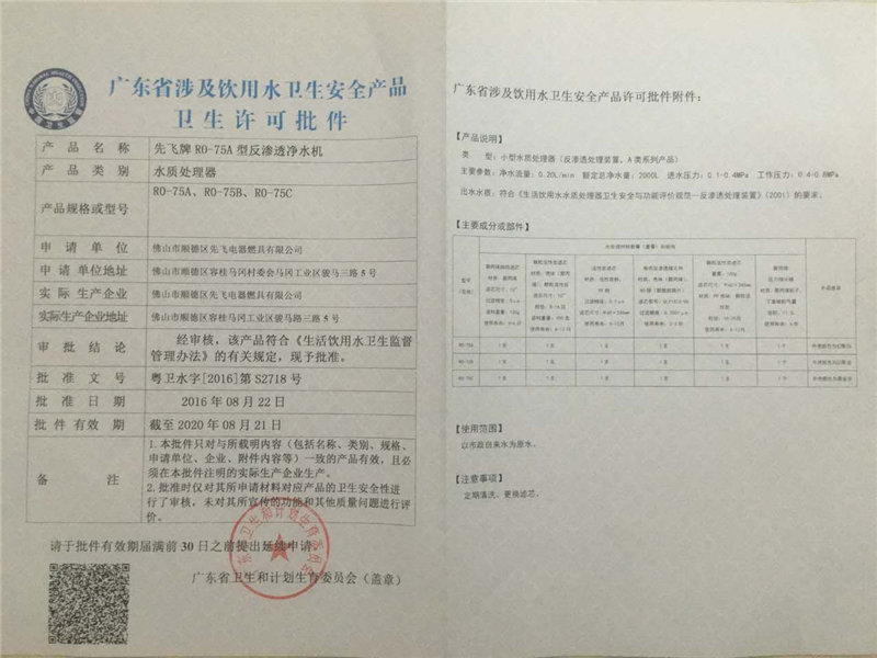先飛公司提示您:購買凈水機一定要關(guān)注兩大批件:一是凈水器檢測報告,二是涉水產(chǎn)品衛(wèi)生批文,也常簡稱為“涉水批文“、”水批”。所謂涉水產(chǎn)品衛(wèi)生批文,是由省衛(wèi)生與計劃生育委員會認證頒發(fā),從凈水器機器質(zhì)量到出水品質(zhì)都已經(jīng)全方位檢驗合格并許可上市銷售。
