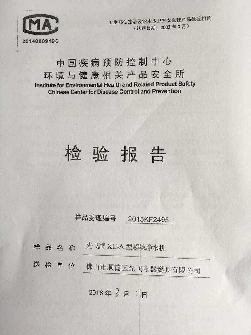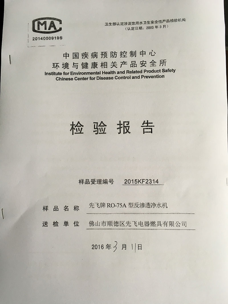先飛廚衛(wèi)繼現(xiàn)代化凈水器無塵車間驗收合格之后,國家權(quán)威部門出具的先飛牌凈水器檢測報告已經(jīng)新鮮出爐。先飛公司認定凈水器行業(yè)是高速增長的朝陽產(chǎn)業(yè),矢志耕耘凈水器行業(yè),先飛凈水器一次性全面通過國家權(quán)威部門的檢測,再一次展現(xiàn)了先飛公司以凈水器產(chǎn)品為核心產(chǎn)品與戰(zhàn)略產(chǎn)品,要力爭成為凈水器行業(yè)的領(lǐng)先品牌的強烈意愿!我們再次呼吁先飛全國經(jīng)銷商朋友們一起高度重視起來,全力以赴推進先飛凈水器產(chǎn)品的銷售工作,讓我們用實干、用奮斗開創(chuàng)先飛凈水器全新的未來吧!
