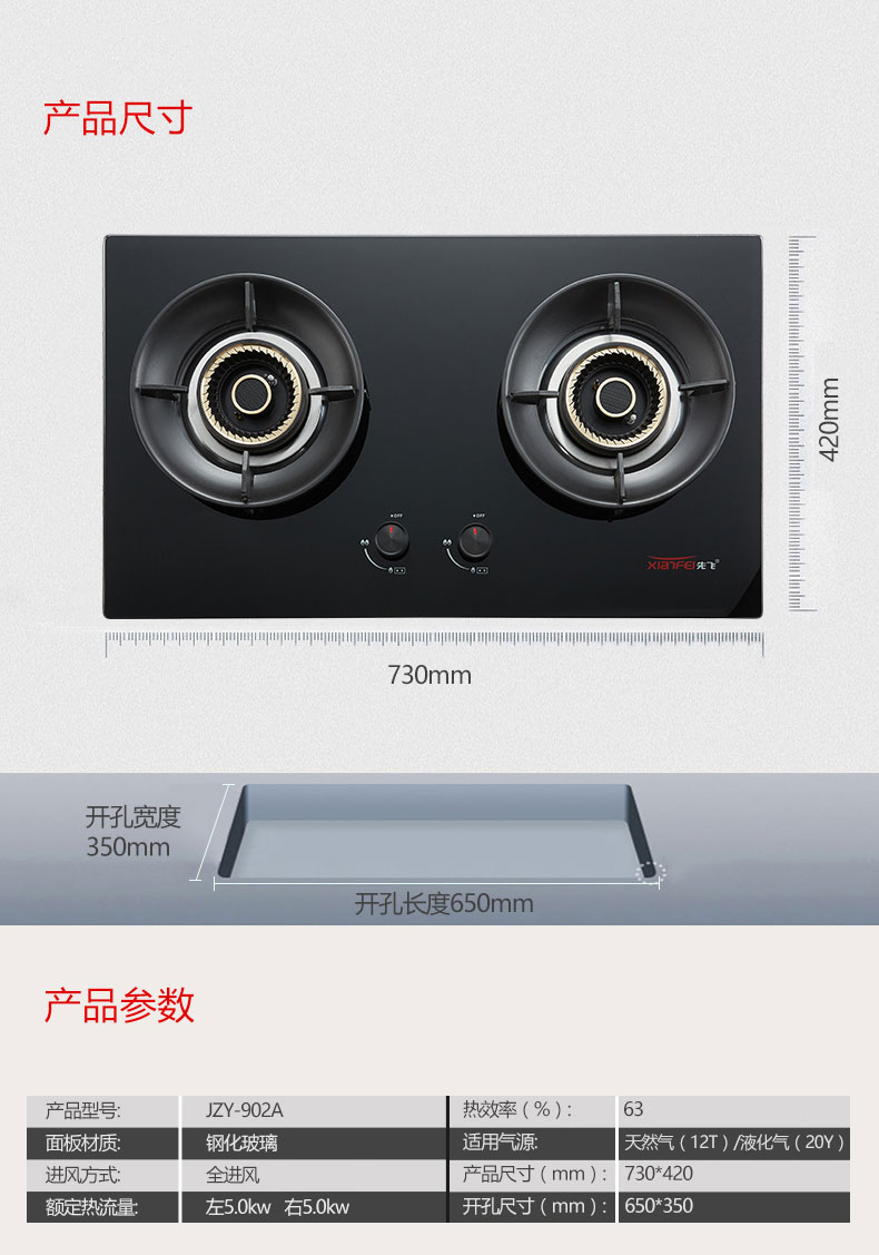 消費(fèi)者說:要一級(jí)能效,要5.0Kw猛火,要聚能盤,要工藝領(lǐng)先,要高大上,要… … 于是先飛灶具902A應(yīng)運(yùn)而生(公司還同時(shí)推出同款單灶556)!先飛902A灶具以產(chǎn)品品質(zhì)優(yōu)越,技術(shù)參數(shù)完美,定價(jià)大眾化的綜合實(shí)力熱火上市,必將成為先飛灶具中的標(biāo)桿與領(lǐng)頭羊!即日起公司已可接受全國客戶訂單,親們還不趕快抓緊下單?